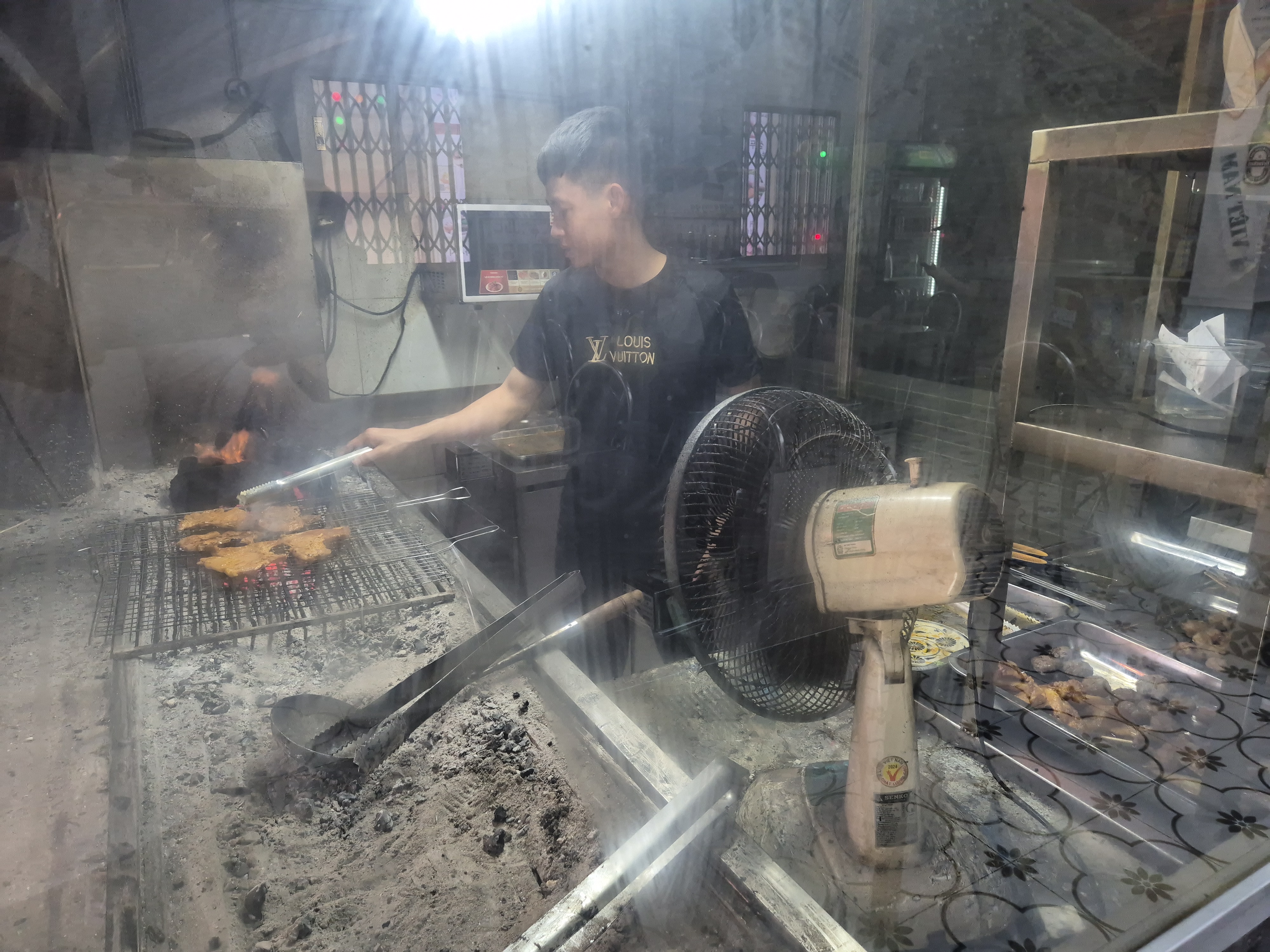 더운 날씨에도 숯불 위에서 고기를 굽고